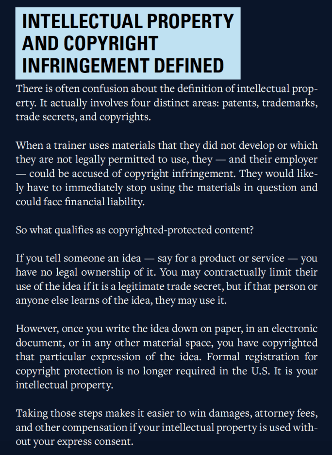 But what happens if the trainer uses copyrighted ideas, concepts, and curricula they didn’t develop and for which they didn’t gain permission? You may not be able to use the books, forms, and scripts for which you paid. And you might become a key witness in a battle over intellectual property rights.