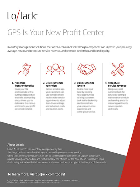 LoJack’s experts say adding a solution that features a sell-through component for F&I will improve that department’s per-copy average while providing customers a tool they can use to integrate their vehicle into their increasingly connected daily lives.