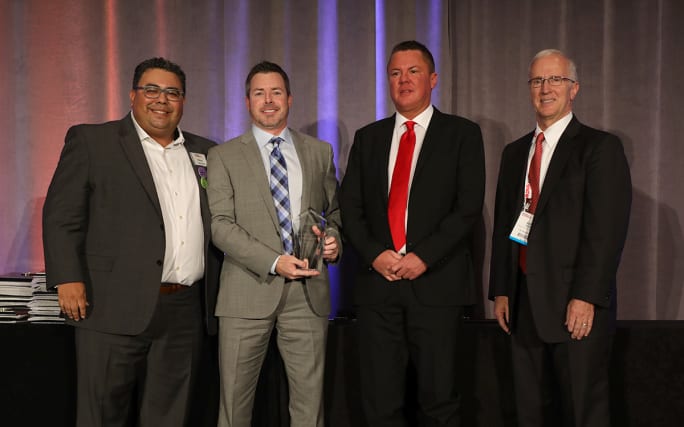 Vice President Jay Prince and F&I Director Brad Richardson are flanked by then-F&I and Showroom editor Gregory Arroyo and Arden Hetland, president and CEO of American Financial & Automotive Systems, after being named F&I Dealer of the Year for 2018.