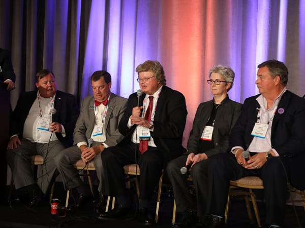 Compliance Summit's closing session, "Is It Compliant?," was led by Bob Harkins of the American Guardian group of companies, who also served as the event's master of ceremonies. Participating in the open forum among speakers and attendees were (from left to right) Terry O'Loughlin, Jim Ganther, Randy Henrick, Lori Church, and Gil Van Over.