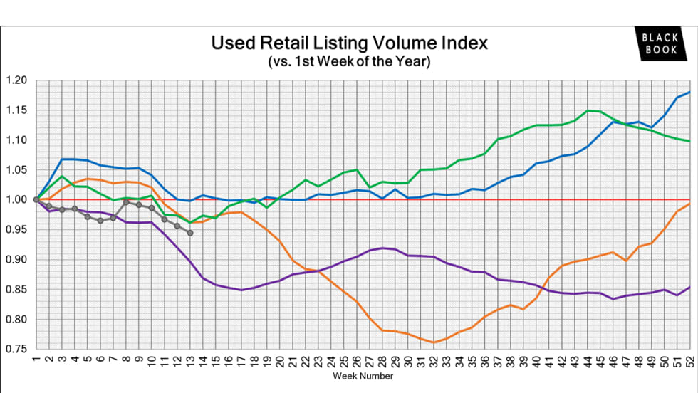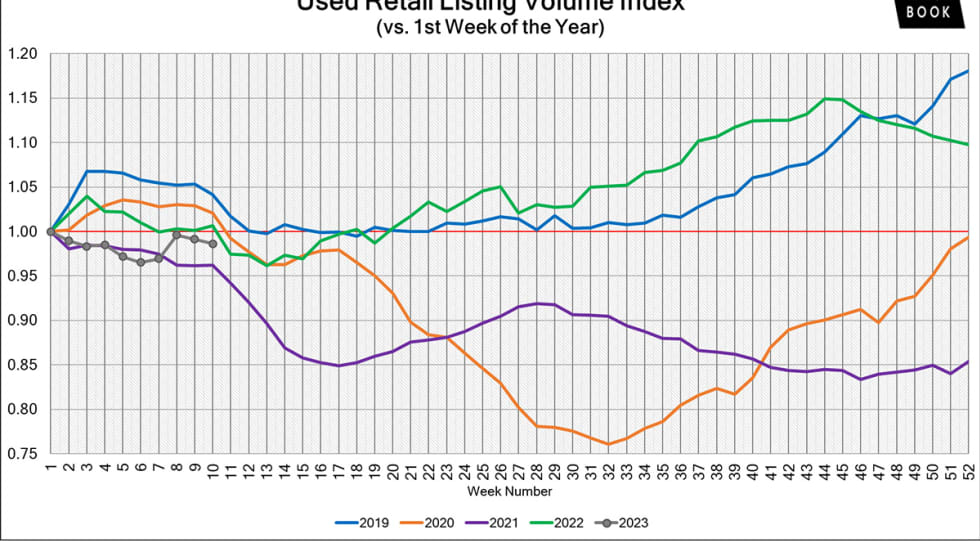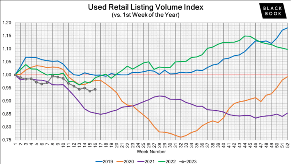 The used retail active listing volume index reverted back to one at the start of 2023. Currently, the index sits at 0.95 points.